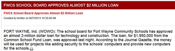 The WOWO story seems to imply that the FWCS school board approved making a loan. The JG story correctly states that FWCS's board approved an application for a loan from a State fund. The WOWO story makes it sound like FWCS approved a loan to itself and fails to explain that the money would be coming from a State fund.